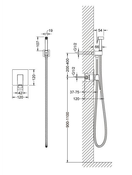 Все коммуникации, крепления и механизмы спрятаны в стену и закрыты декоративной накладкой, снаружи находится только рычаг управления смесителем и держатель гигиенической лейки с подключеним шланга. Длины шланга 1,2 метра хватает для решения гигиенических задач.