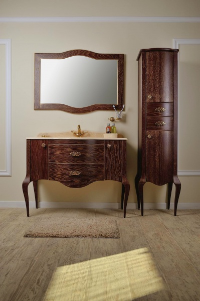 Мебель выполнена в легком классическом стиле для ванных комнат. Для производства пеналов используются только долговечные влагостойкие материалы.